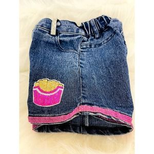 Girls dark denim shorts that have been upcycled and bedazzled in pink rhinestones and sequin patches to make them one of a kind to own. Every girl loves the word "love", color "pink" and some french fries.