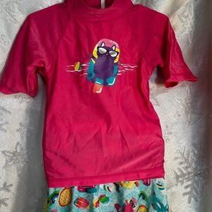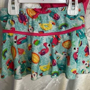 Excellent condition, one child. Fragrance-free. Very adorable girls UVSkinz UPF Swimsuit. Shirt and skort are separates, easy to use at the pool, lake, beach. Cute cat and summer pool float print.