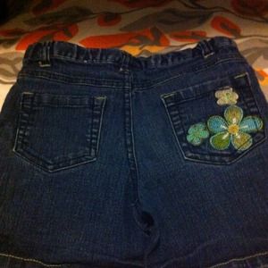 Dark denim, 4T, Arizona brand, floral embroidery in lime green, light blue, and white, seams are lime green, has cinching for small waists.