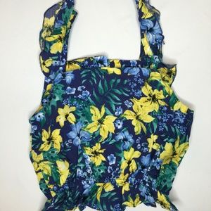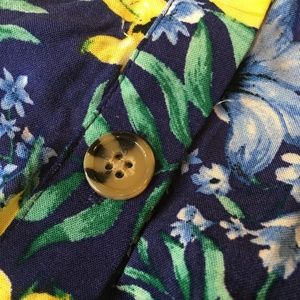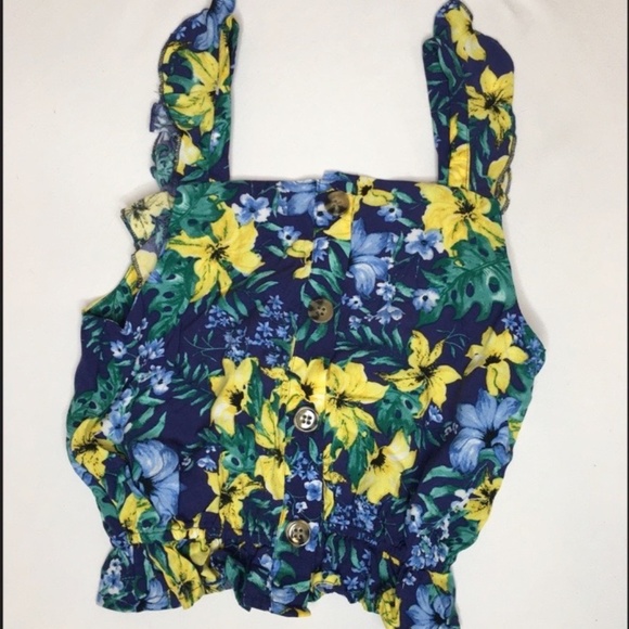 Blue Top with floral print in yellow and baby blue tones. Has ruffles on the sleeves and brown buttons on the front. NWT