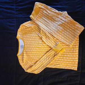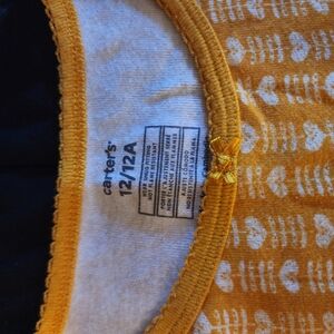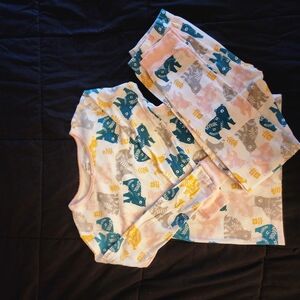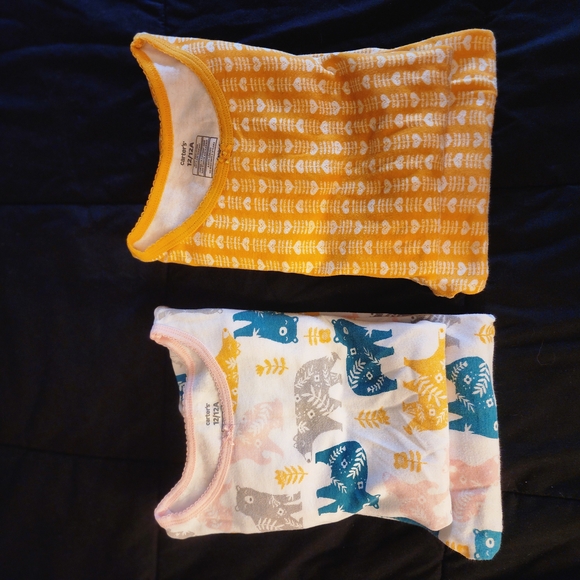 Adorable two sets girls pj's. Carter's Brand. One in yellow with white patterns. The other features a multicolor animal print.