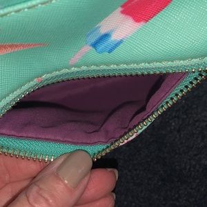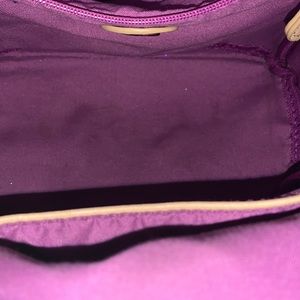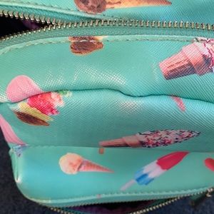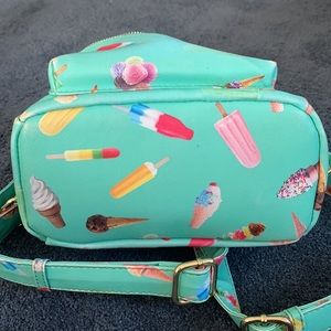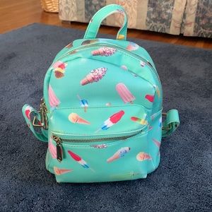 Cute mint green with ice cream design backpack. My daughter used it as a purse. In EUC inside is clean as is the small front zippered compartment. It has adjustable straps, two inside pockets, one zippers and one does not. Bottom is clean. Top front has a slight fading but not really noticeable. Great bag from Charming Charlie’s.