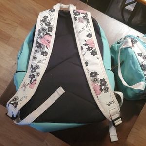 Blue Boon Backpack & Matching Lunch Box. In Used condition stains on both of them have stains on the bottom. Inside of backpack has a laptop sleeve and pencil pouches. Inside 9f Lunchbox has mylar coating