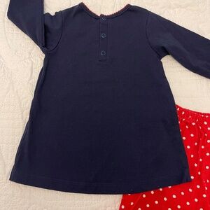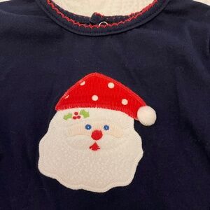 Navy blue top with Santa in red corduroy hat applique - 3 buttons in back; red trimmed neckline; red dotted corduroy sleeve rrim