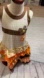Design: Multi-colored with orange and brown tones, featuring a playful mix of polka dots and stripes throughout the dress.