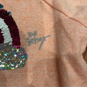 Up for sale is a preowned Girls Betsy Johnson Reversible Sequins Rainbow Top Sweater Size M Medium 10. Super cute and warm Coral Color too with rainbow sequins that are reversible. Long sleeves have cuffs at the end and bottom of shirt is ruffled. 95% Polyester/5% Spandex. Message me with any questions or if you'd like specific measurements before purchasing