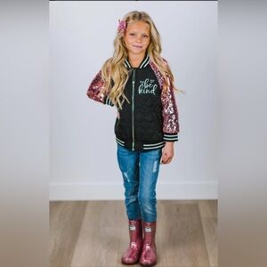 Girls Black Bomber Jacket Pink Sequin Sleeves Be Kind Graphic Sparkly Sm NIP