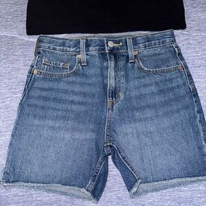 Stylish black tank top with a graphic design featuring a sunset size 10/12 new with tag. Paired with classic blue denim shorts has adjustable waistband size 10 new without tags. Both are from Old Navy.