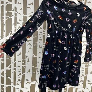 Art Class Girls Black Velvet Long Sleeve Halloween Dress sz XS 4/5. Features shiny stretchy black velvet fabric with allover novelty Halloween print of skulls, Jack-O-Lanterns, "Trick or Treat", "Party Time!", etc., empire style waist. Gently worn and laundered with no flaws to note. The perfect dress for your little girl's Halloween party!!