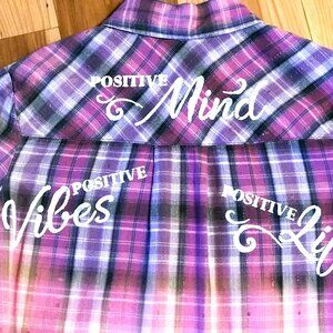 Upcycled bleached and inspirational handmade painted shirt, teen girl size 14. This would make a great gift for any teenage girl. The shirt is sparkly with shades of pink and purple plaid, and "Positive Mind, Positive Vibes, Positive Life" is painted onto the back. Perfect for any teen who needs some inspiration or wants to be a positive role model to others.