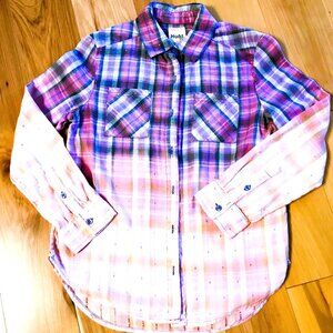 Girl's Bleached Painted Shirt, Size 14: Upcycled Inspirational Purple Plaid Top