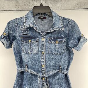 This stylish shirt dress combines classic design with modern flair, featuring a blue acid wash finish and distressed detailing for a trendy, lived-in look. The button-front closure and adjustable belt allow for a customizable fit, while the shirt collar and cuffed sleeves add a touch of sophistication. Crafted from soft, durable fabric, this dress ensures comfort throughout the day, making it perfect for casual outings, school events, or weekend adventures.