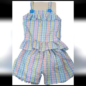 This girls' outfit set features a blue and green checkered pattern. The set includes a cotton dress shirt with Elastic Strap on Shoulder and pleated accents and a zip closure, as well as matching shorts with an elastic waistband. The outfit is perfect for a variety of occasions, such as travel, parties, and casual outings. The set features a range of characters, including Belle, Captain America, and the Easter Bunny, as well as a variety of themes such as art, butterfly, and bohemian. The garment care is easy, as the set is machine washable and wrinkle-resistant. It is suitable for seasons like summer and spring and is made in India.