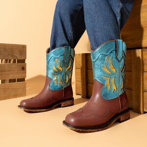 ⚡Girls Blue Square Toe Mid Calf Cowgirl Boots Western Fashion Riding Shoes