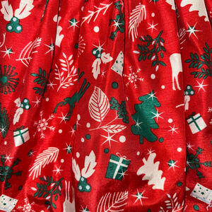 This is a pre-owned Bonnie Jean dress, size 2T. The dress is red with a Christmas-themed pattern featuring white reindeers, snowflakes, and green Christmas trees and gifts. It has long sleeves and a ruffled collar. The dress has a cream-colored band around the waist with embroidered gift designs. The material is 65% polyester and 35% cotton. A zipper is located on the back for closure. There are no visible imperfections.