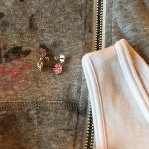 Aero grey/pink floral light hoodie, 2 sparkling white tanks(unbranded,) and pink flower earrings