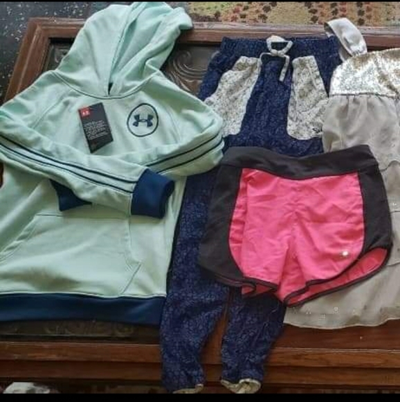 Girl's clothing bundle size 8/10. Some brand new. Brands include Under Armour sweater, Roxy pants, American Girl dress, & Carter's dress.