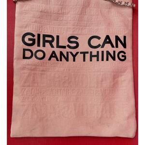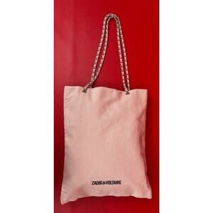 Girls Can Do Anything Parfum Bag by Zadig & Voltaire light pink canvas bag features bold lettering with raised subtle Zadig & Voltaire monograms on the front, the back features the Zadig & Voltaire name to be seen, silver tone chain strap with intertwined matching light pink canvas fabric, open top, the interior is lined in a soft pink fabric lining which is nice and clean with no stains, no holes, a few faint light marks are barely visible on the exterior, carried about 3 times, smoke/pet free.