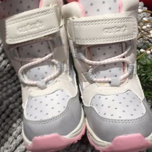 Excellent used condition, girls toddler Carter snow boots. Pink, gray and white in color. Only worn once. No wear to soles. Velcro straps, easy slip on. Super cute!!