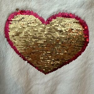 This adorable girls' fuzzy top features a charming gold heart design on a soft white background. Perfect for Valentine’s Day or every day wear. Top is fuzzy but lightweight.