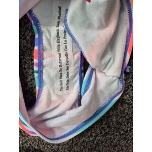 This two-piece bikini set features a vibrant multi-color striped design, offering a stylish and fun swimwear option. The one-shoulder top provides a secure fit, while the side-tie bottoms ensure adjustable comfort for active days at the beach or pool.