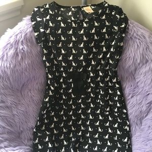 Black and white cat patterned dress with a silky feel to it. Very light and airy, with a black ribbon bow at waist. This was one of my daughter's favorites! Preloved but in perfect condition.