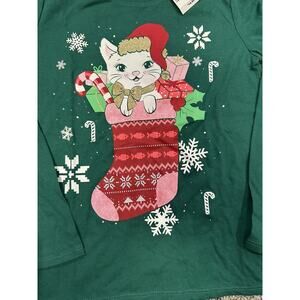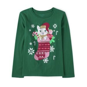 This Girls Cat Stocking Graphic Tee in Park Bench Green is a must-have for any feline lover. The long-sleeved crew neck tee features a classic fit and pullover closure, perfect for casual occasions. The cotton blend material ensures comfort, while the Christmas and cat themes add a touch of fun.