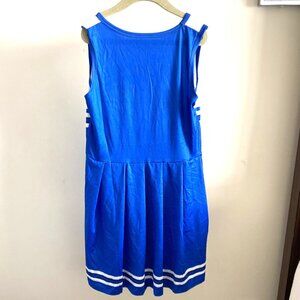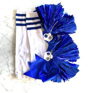 Set includes 1 cheerleader dress, 1 hair bow, 1 pair of cheerleading pom poms, 1 pair of striped socks. Soft elastic material and great for any occasion (Halloween, dress up, dance, cheerleading, etc.)