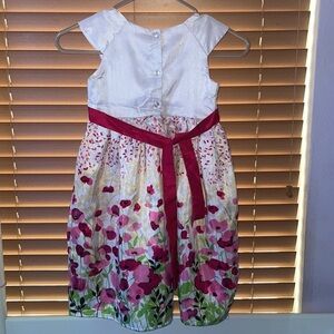 Size 6 girls Cherokee dress made in Sri Lanka has a button up back and a pink attached belt. A beautiful flower print on the skirt and has no stains damage or tears. Perfect for church or events.