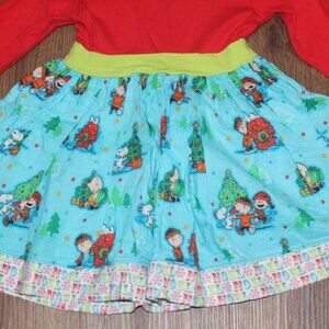Super cute boutique dress by Chris N Missy. Knit bodice with long sleeves and super cute Peanuts holiday fabric in the skirt. Beautiful Noel trim fabric. Such a sweet dress!