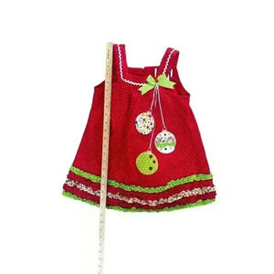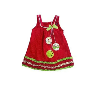 This is a little girls ruffled, pinafore dress. It is a little girls size 4. It is red with white polka dots. It features a white rick rack trim, a bow, and colorful christmas ornaments. It has 3 ruffles at the bottom. It is red, white and green. It is soft, and made from 100% cotton. It should be handwashed, and lay flat to dry. It is made by Rare Editions.