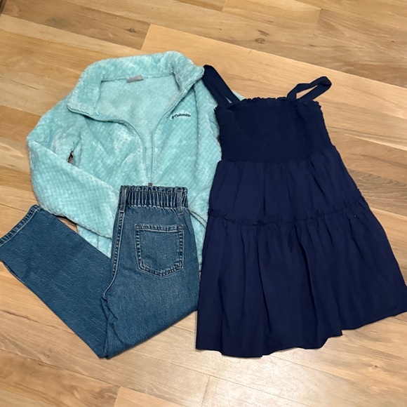 Girl’s clothing bundle! Size 10 Cat and Jack new with tags paper bag waist jeans, Columbia pullover in a size 10-12 that was worn once, and navy blue cotton dress in a size L/10. All either perfect or barely worn.