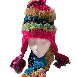 • The earflap hat can be worn with the earflaps up or down, while the scarf can be draped or tied ( doubled in photo) in various ways, allowing for versatile styling