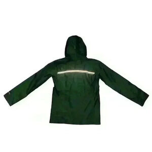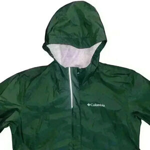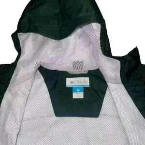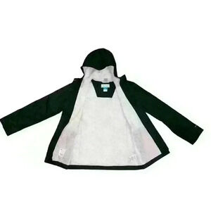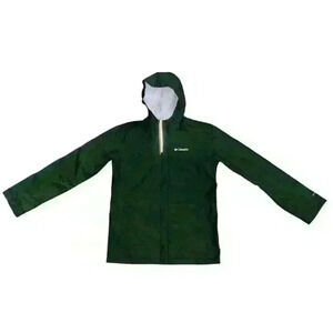 This is a pre-owned Columbia Girls Watertight II Jacket in size Large. The jacket is a dark green color with a white Columbia logo on the left chest. It has a full-zip front closure, a hood, and two zippered pockets. The jacket is made of a water-resistant nylon fabric with a mesh lining. The jacket is in good condition with no visible tears or holes. The jacket is fully functional and ready to wear.