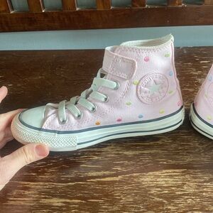 Worn 1 time. Bought from Nordstrom. Totally clean inside and out, with the exception of a tiny spot on the top of each toe(I took a pic, but it’s hard to even see. Pink Converse with poka dots.