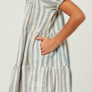 Girls Cotton Striped Square Neck Puff Sleeve Tiered Dress