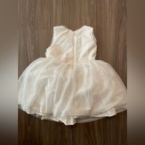 Elegant white sleeveless dress with floral details and a tulle skirt. Perfect for special occasions.