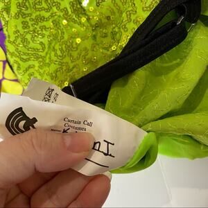 Lime sequin poly/spandex and black nylon/spandex short leotard, with attached printed poly/spandex and tricot layered skirt. The original costume had a shirt also but that is not included.