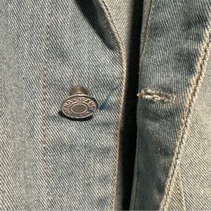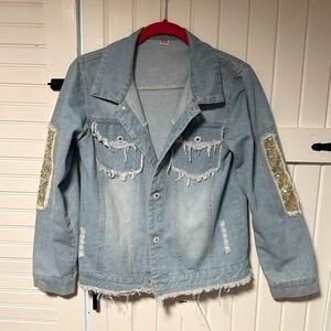 Girls denim jacket with embroidery on the back of a girl holding her cat. The elbows also have patches of gold sparkles.