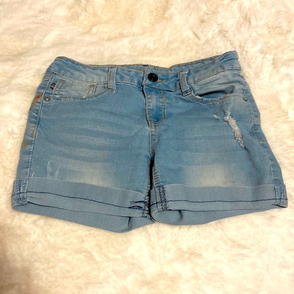 Washed out light denim shorts with Sequin Butterflies on the back pockets. Adjustable elastic not included.