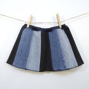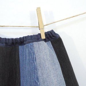 This was up-cycled from jeans in excellent used condition. Pre-washed elastic was used for the waist and it will not shrink in the wash.