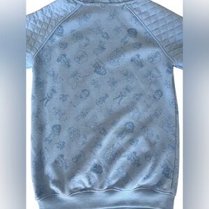 Add a touch of Disney magic to your little girl's wardrobe with this girl's sweatshirt featuring popular characters such as Snow White, Aurora, Tinker Bell, Jessie, and Mirabel. See many other favorite Disney characters printed front and back hidden in a bit darker blue than the hoodie, like your own personal I Spy game. The sweatshirt is made of a comfortable and breathable cotton blend material, perfect for any occasion from traveling to parties to casual wear. With a long sleeve and pullover closure, this regular fit sweatshirt also comes with a hood, pockets, and is wrinkle-resistant. EUC