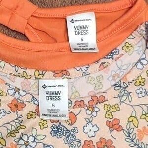 Bundle of two Yummy Dress dresses from Member's Mark, super soft jersey fabric. One sleeveless with floral pattern, the other solid orange with back cutout and bow.