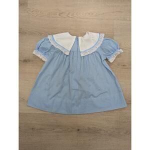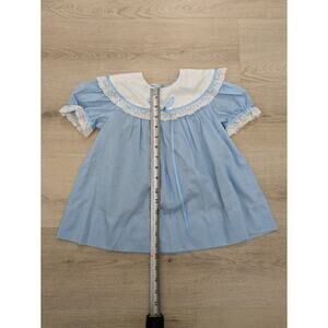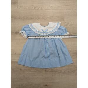 Add a touch of vintage charm to your little girl's wardrobe . Featuring a pastel blue polka dot pattern and white lace detailing, this dress is perfect for any occasion. The short sleeves and cotton material make it comfortable for all-day wear, while the 1970s design adds a retro touch. This original, unmodified dress is ideal for parents looking for a unique outfit for their child. It is a rare find for those who appreciate vintage clothing. Whether you're a collector or simply looking for a special piece for your little girl, this dress is sure to impress.