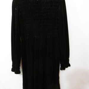 Black Dress, velvety feel with roses attached to gathered body. Size 6 zippered back opening Long sleee