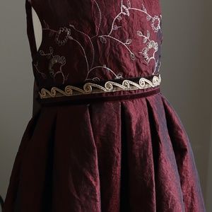 This Little Girl's Special Occasion Dress is Beautiful! Made of a deep Wine/Burgundy taffeta, this dress is most luxurious. The fabric is called "Shot Taffeta" or also known as iridescent. When seen from different angles, the weave creates a luxurious sheen. It is also a "Crinkle Taffeta" which creates even more dimension. The top is sleeveless and has a dainty floral embroidered design in fine burgundy, gold and silver threading.The waist has a double velvet trim accent. The top velvet ribbon trim is two-tone and has a lovely scroll pattern embroidered across it in metallic gold and a lighter gold embroidery threading. The bottom velvet ribbon color blends in with the deep rich wine color of the dress. From the waist, the flared skirt has a sophisticated box pleat design. A matching sash ties in the back for a perfect fit. Zipper back closure. The skirt is lined with a slip that has a mesh ruffle that adds volume to skirt. This dress looks like it was designed for royalty-Just Gorgeous!! Perfect for Special Occasion, Parties and would be gorgeous for a flower girl!!! Size 18/24 months, but will fit 2 year also (see measurements for fit). NEW WITH TAGS!