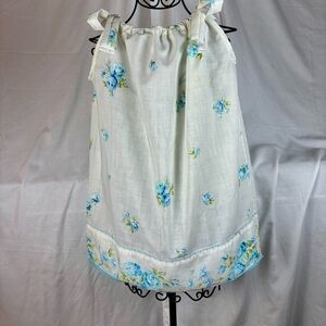I made this from a vintage pillowcase. This girls sundress features a soft white base with a charming floral print in blue tones. Its lightweight fabric and gathered neckline make it perfect for casual playtime.