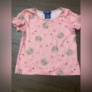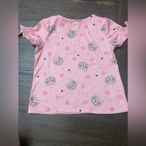 A short-sleeved, light pink t-shirt with an all-over print of teddy bears, hearts, and flowers. The sleeves have tie details at the ends. A pair of dark wash denim shorts with cuffed hems. The shorts feature an embroidered teddy bear face on the front pocket.