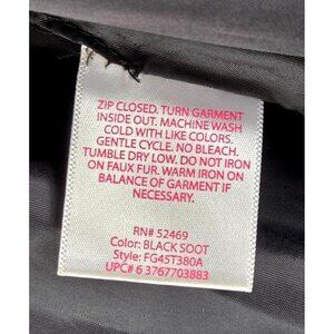 Care: Zip closed, turn garment inside out. Machine wash cold with like colors. Gentle cycle, no bleach. Tumble dry low, do not iron on faux fur. Warm iron on balance of garment if necessary.