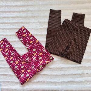 One capris length, one ankle length. Both in good used condition. Knees on pumpkin pair show wear.